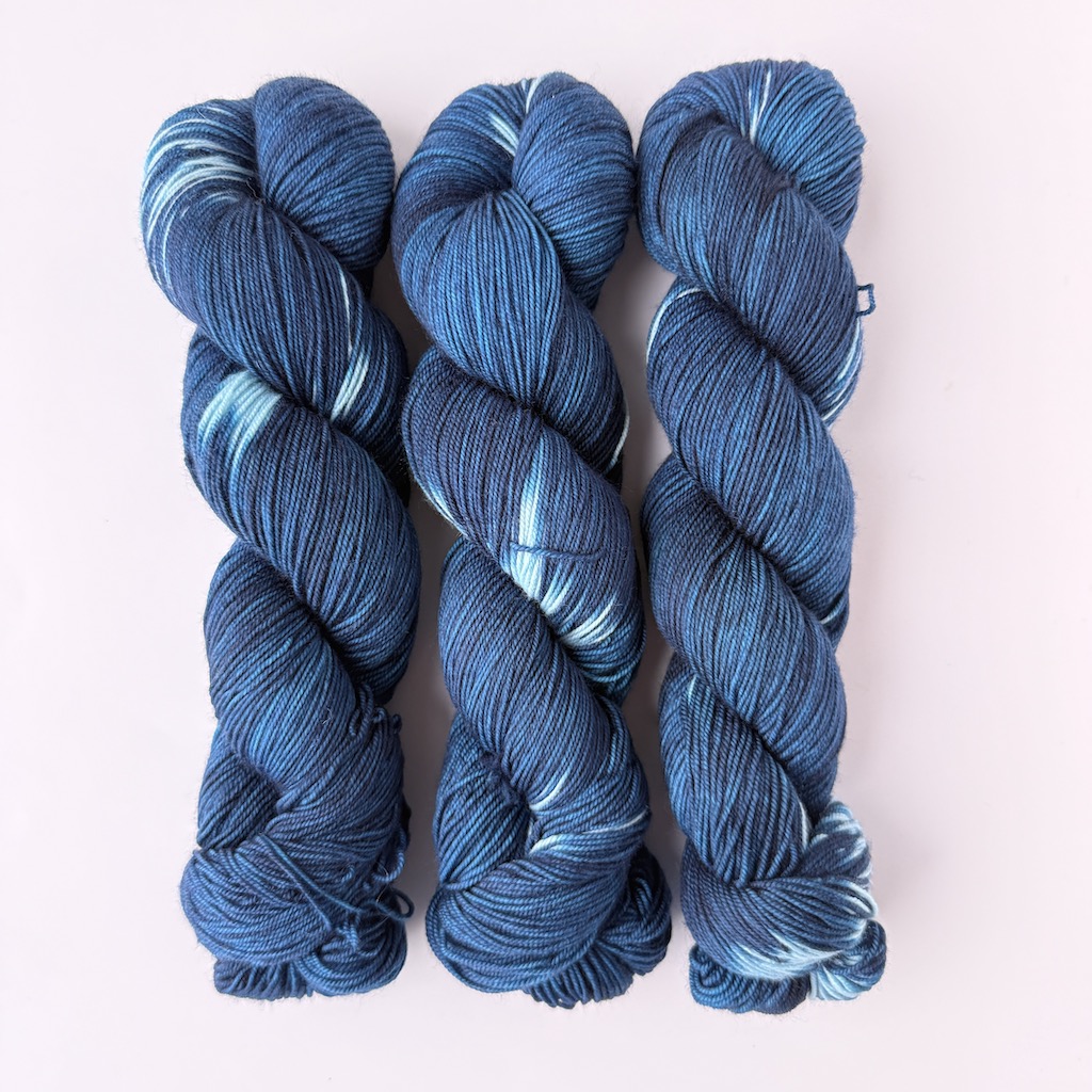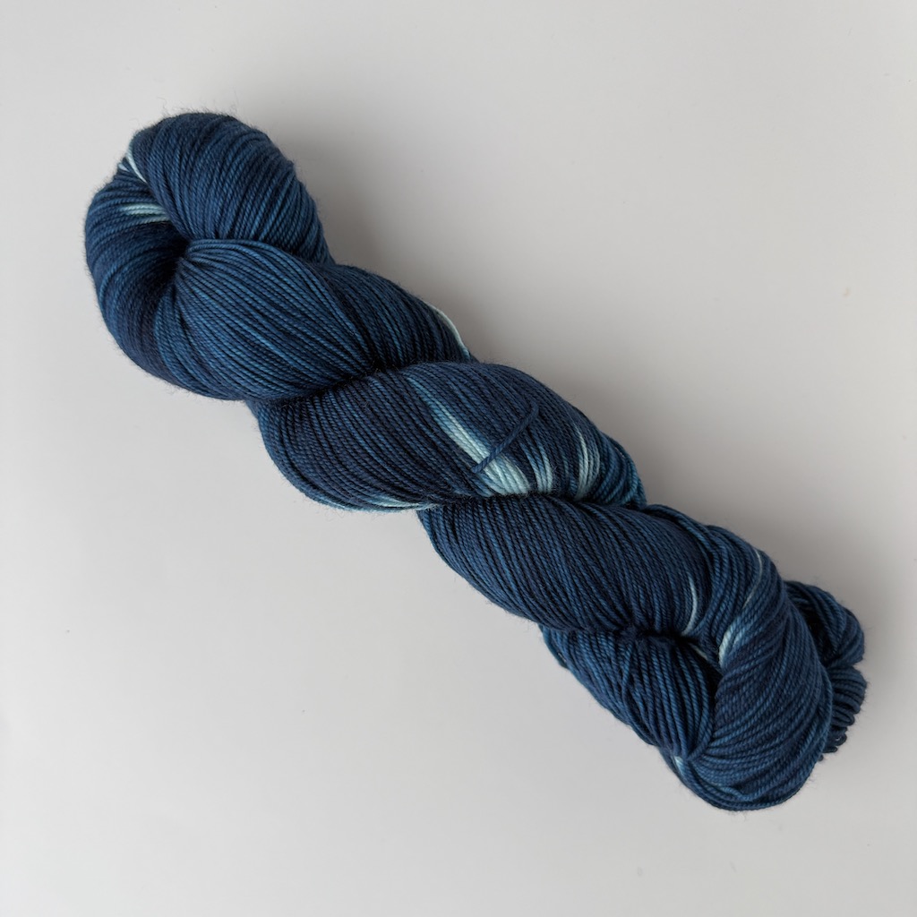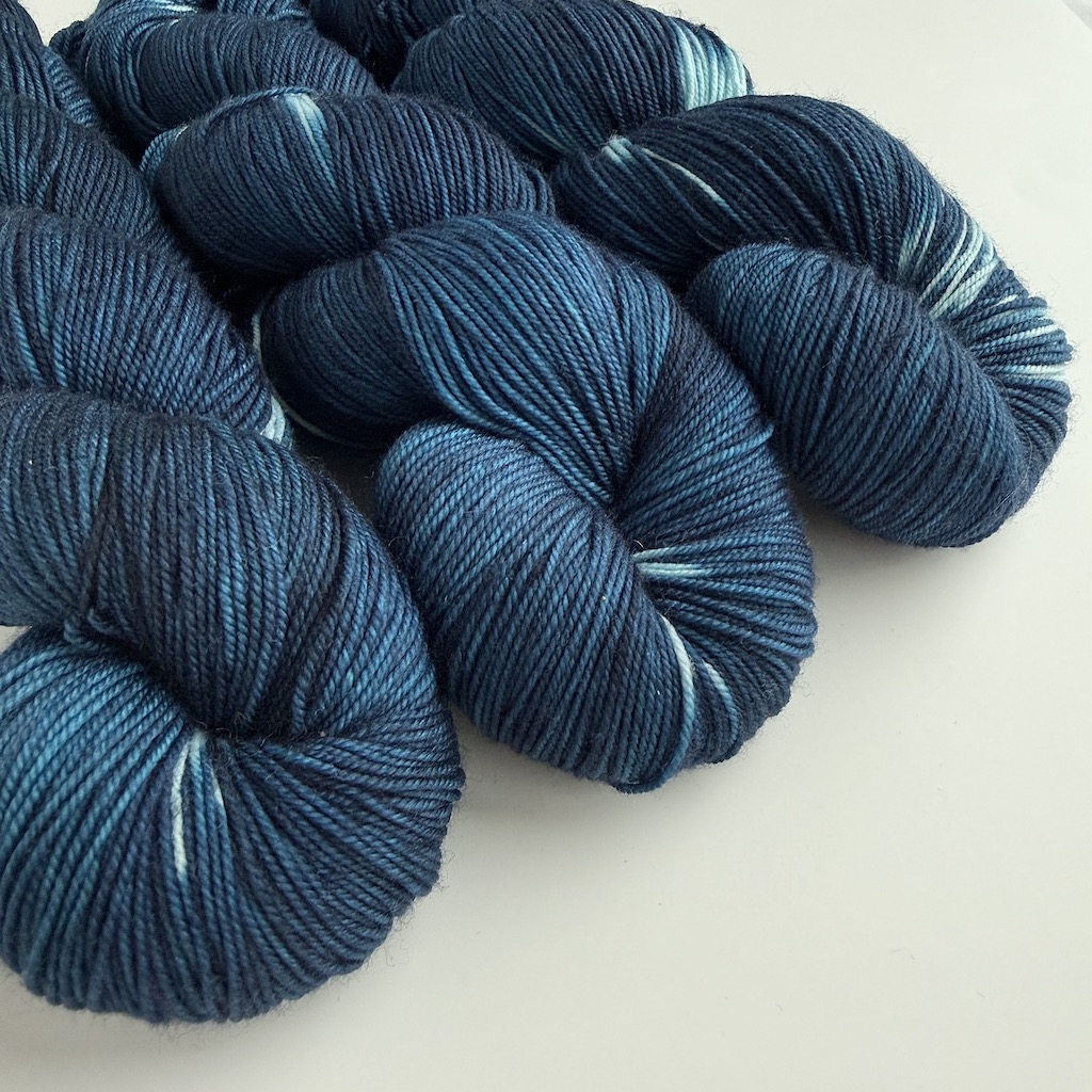 Een tie-dye kleurtje zoals we dat noemen. Deze verf ik door tie wraps rond de streng te doen. De kleur die ik verf kan niet onder de tie wraps raken omdat deze het garen samen knijpen. Hierdoor krijg je de kleine lichtere plekjes met een duidelijke rand.
