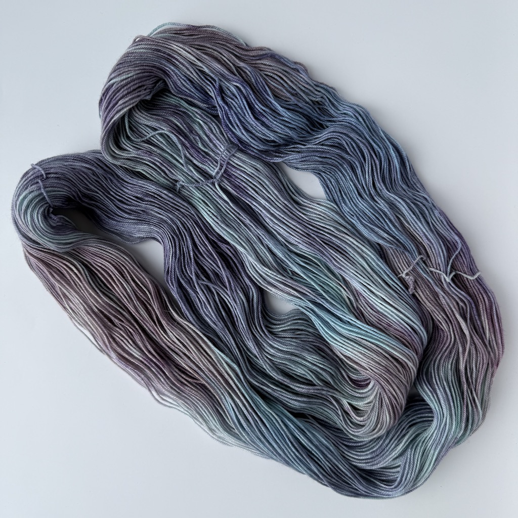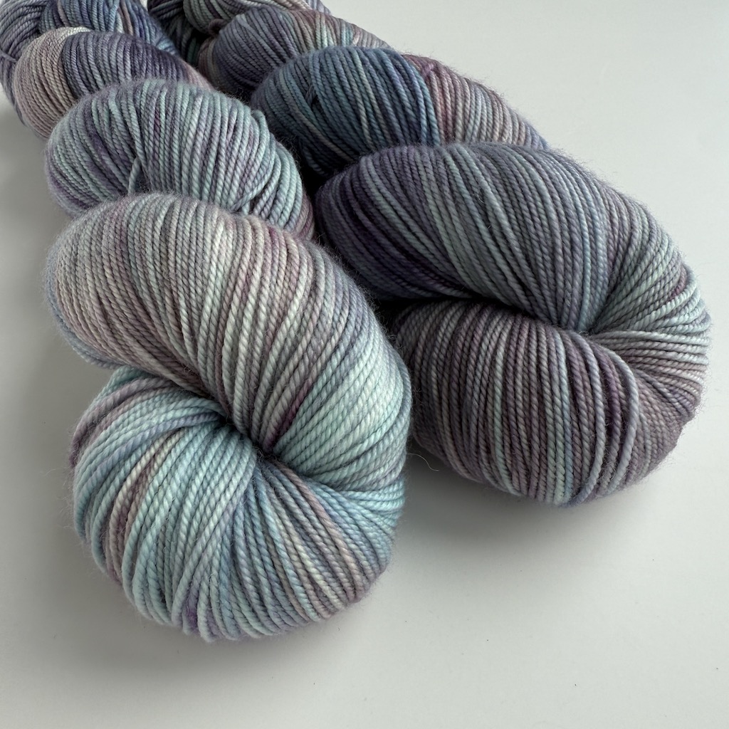 Voornamelijk oud roze en lavendel-paars met accenten van aqua en blauw.
